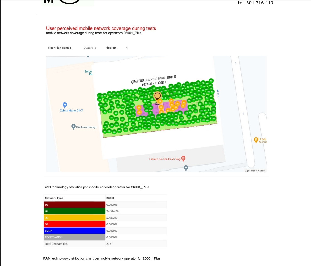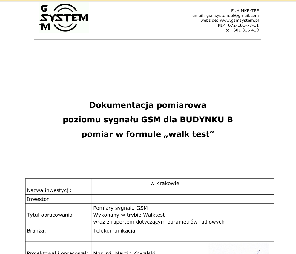 ? Wykonanie pomiarów pokrycia siecią komórkową (GSM, UMTS, LTE) wszystkich operatorów na każdym piętrze budynku oraz w strefach technicznych i parkingach.